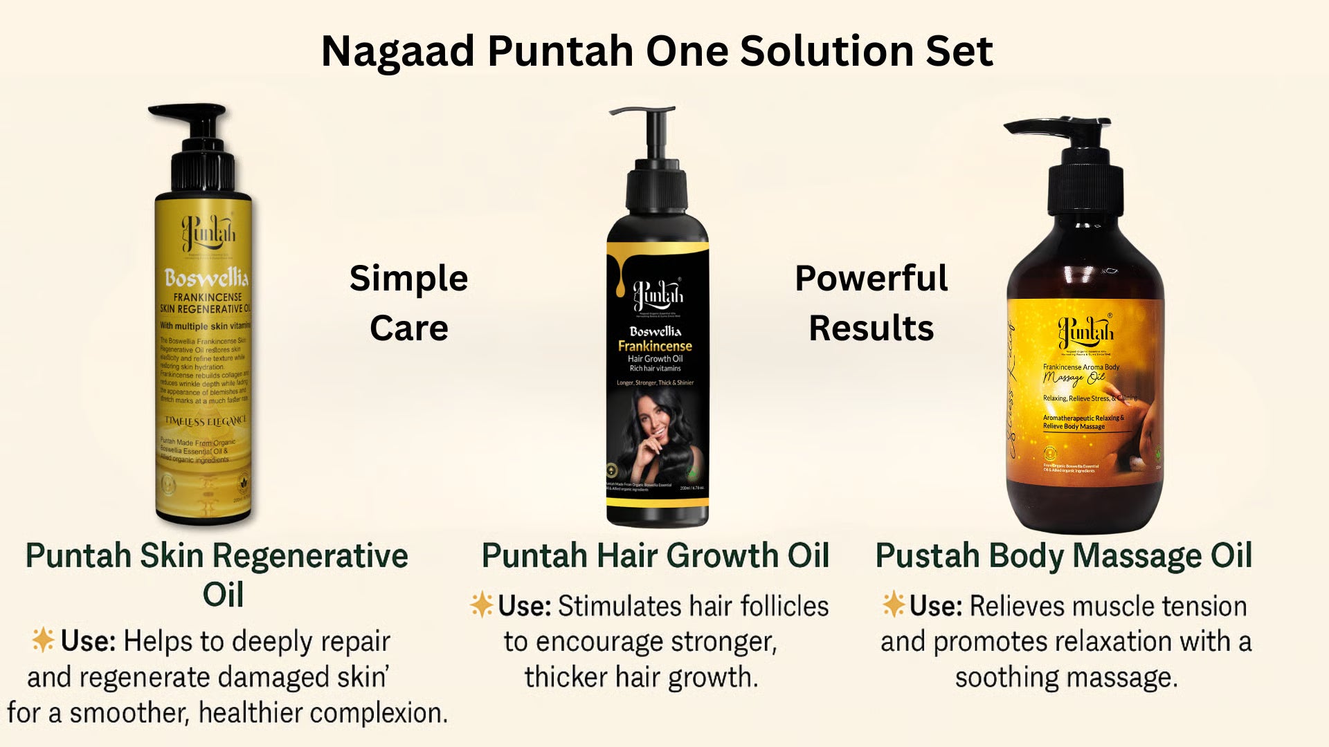 The Nagaad One Solution Set is a premium trio of wellness essentials crafted to elevate your self-care ritual. Featuring Frankincense Regenerative Oil, Frankincense Hair Growth Oil, and Frankincense Body Massage Oil, this all-in-one collection rejuvenates skin, boosts hair health, and enhances overall well-being through the powerful properties of frankincense.